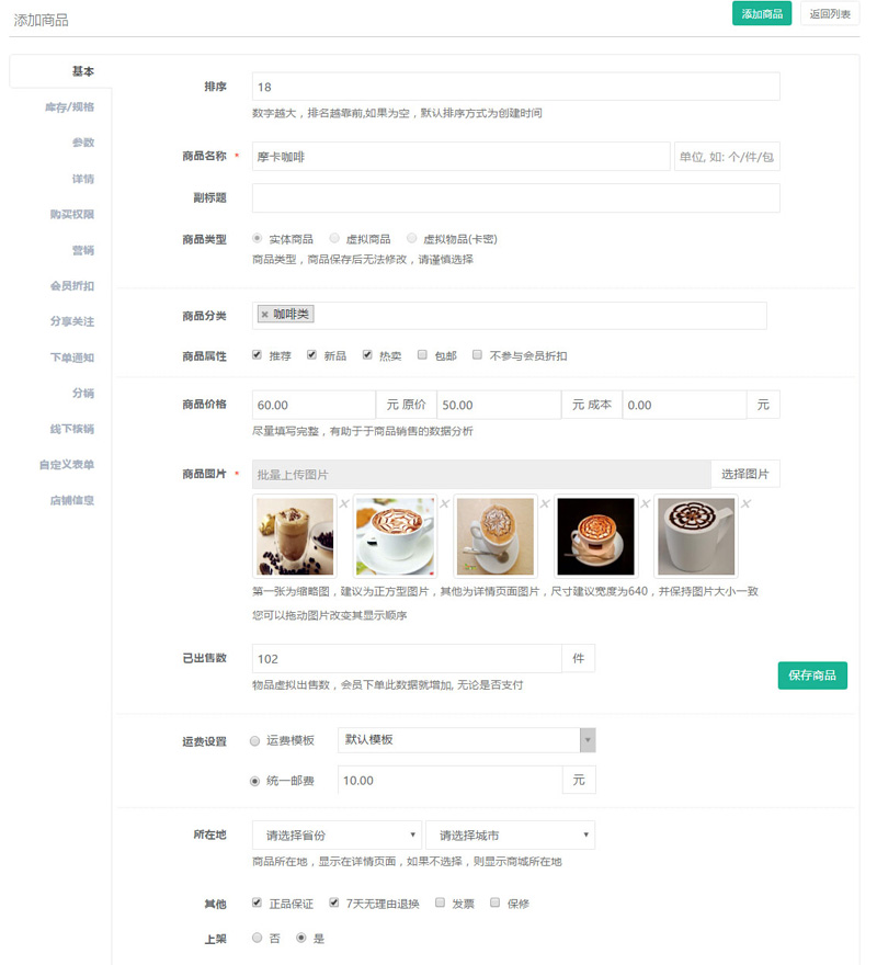 “商品分類”選擇已添加設(shè)置的分類信息即可,點(diǎn)擊查看商品分類操作鏈接。