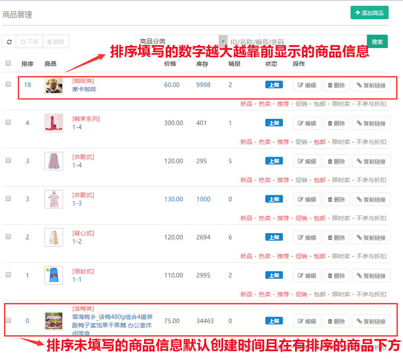 商品的排序是按照“基本”中填寫的數(shù)字信息進(jìn)行排序的,數(shù)字越大信息越靠前顯示,如不填寫則默認(rèn)為創(chuàng)建添加的商品日期,添加的商品越晚則信息會(huì)越靠前顯示,添加的商品會(huì)在已填寫數(shù)字排序的最下方顯示,參見下圖: