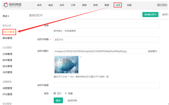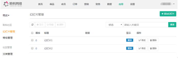 1.幻燈片管理:社區(qū)的幻燈片上傳后,前臺(tái)進(jìn)入社區(qū)在首頁(yè)頂部顯示,上傳的幻燈片狀態(tài)需是“顯示”反之則不顯示,參見(jiàn)下圖: