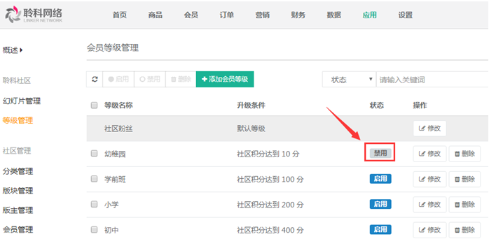 添加完畢后的等級(jí)信息在【等級(jí)管理】列表中顯示,默認(rèn)為“禁用”狀態(tài)需要點(diǎn)擊切換為“啟用”,會(huì)員達(dá)到條件才能自動(dòng)升級(jí),參見(jiàn)下圖: