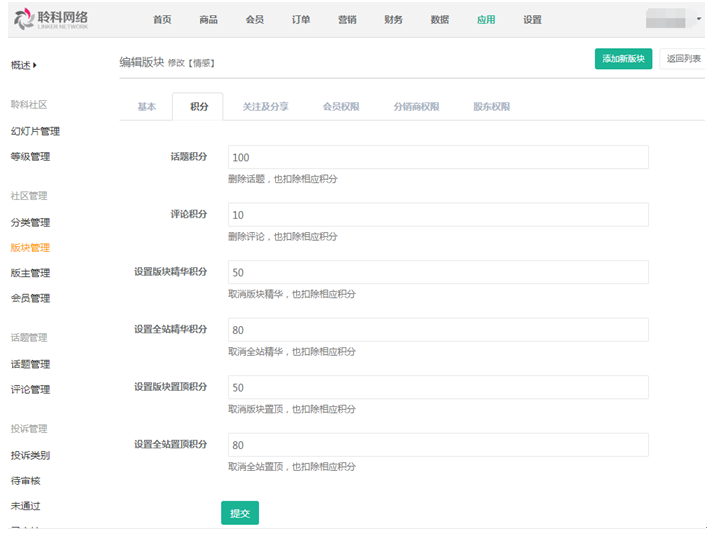 社區(qū)是來(lái)設(shè)置商城會(huì)員、分銷(xiāo)商、股東的交流論壇,添加論壇版塊設(shè)置會(huì)員、分銷(xiāo)商、全民股東等級(jí)分組權(quán)限,瀏覽發(fā)帖,設(shè)置各分銷(xiāo)商互相查看發(fā)帖信息可刺激分銷(xiāo)商的分銷(xiāo),獲取高傭金,有效提升商城銷(xiāo)售量。商城會(huì)員、分銷(xiāo)商或股東只要點(diǎn)擊進(jìn)入論壇頁(yè)面,就會(huì)在社區(qū)會(huì)員管理中,統(tǒng)計(jì)會(huì)員進(jìn)入社區(qū)的積分、話(huà)題、評(píng)論等信息。社區(qū)的會(huì)員積分統(tǒng)計(jì)的是會(huì)員、分銷(xiāo)商及股東在商城發(fā)帖獲得的積分,而商城的會(huì)員積分統(tǒng)計(jì)是統(tǒng)計(jì)會(huì)員在商城購(gòu)買(mǎi)商品或充值或掃描二維碼等獲得的積分以及在社區(qū)發(fā)帖的積分。
