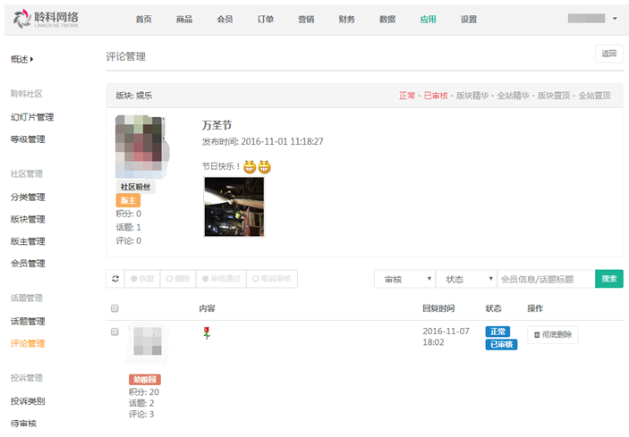 點(diǎn)擊某話(huà)題詳情,可查看具體的話(huà)題內(nèi)容和對(duì)該話(huà)題的所有評(píng)論,也可以對(duì)評(píng)論進(jìn)行狀態(tài)改變和刪除,參見(jiàn)下圖: