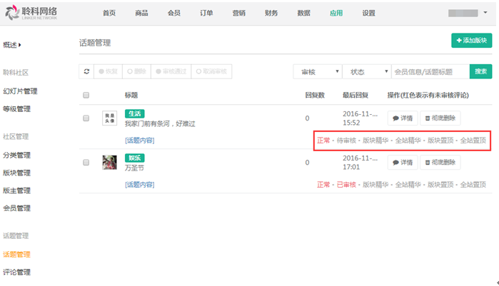 7.話(huà)題管理:可查看所有會(huì)員、分銷(xiāo)商貨股東所發(fā)布的話(huà)題,點(diǎn)擊相應(yīng)的狀態(tài)可對(duì)狀態(tài)進(jìn)行改變,參見(jiàn)下圖: