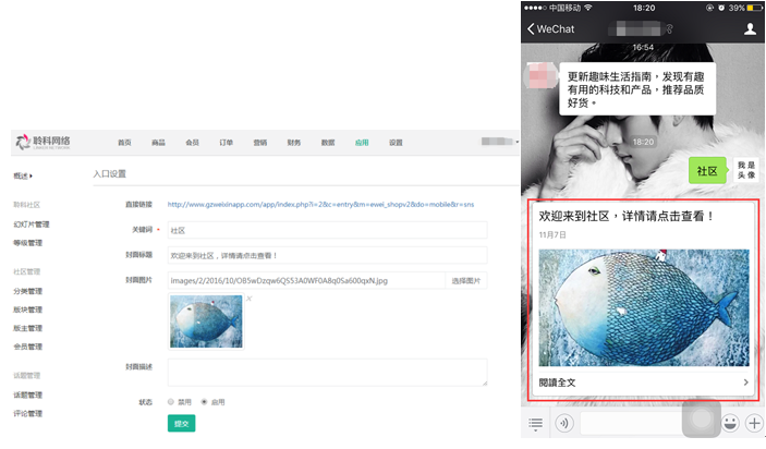10.入口設(shè)置:填寫(xiě)相關(guān)的設(shè)置信息后,用戶(hù)在公眾號(hào)發(fā)送對(duì)應(yīng)的關(guān)鍵詞可獲得社區(qū)的入口信息,點(diǎn)擊即可直接進(jìn)入社區(qū),參見(jiàn)下圖: