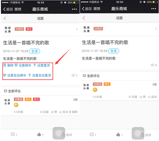 1) 超級(jí)管理員:選擇已關(guān)注商城公眾號(hào)的工作人員,作為商城社區(qū)的超級(jí)管理員,即可直接通過(guò)前臺(tái)對(duì)會(huì)員、分銷(xiāo)商、股東已發(fā)的帖子進(jìn)行相應(yīng)的置頂、刪除、精華等操作,而非超級(jí)管理員則只能評(píng)論和查看,參見(jiàn)下圖: