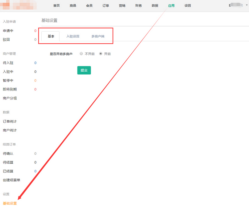 商家首先在【應(yīng)用】——【多商戶】——【基本】中開啟多商戶按鈕,參見下圖: