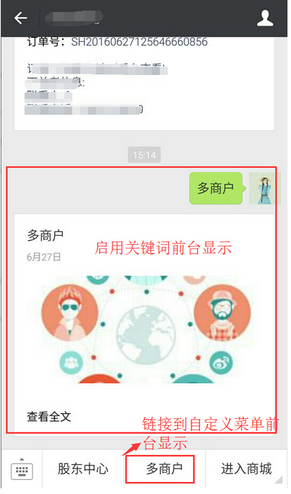 會員申請入駐到商城中成為多商戶銷售產(chǎn)品,在【入口設(shè)置】將鏈接復(fù)制到自定義菜單或啟用關(guān)鍵詞,申請入駐的商家就可以再關(guān)注的商城自定義菜單或輸入關(guān)鍵詞進行申請,參見下圖: