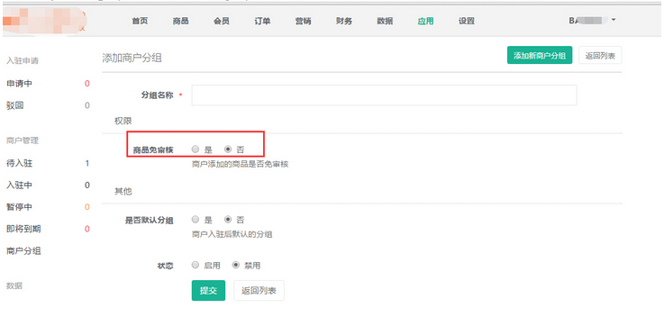 選擇的商戶組在【商戶分組】進行添加,商戶組有兩種權(quán)限,一種是入駐的多商戶商家上傳的商品需要商城審核,審核通過或才能上傳到多商戶中進行銷售;而以一種是不需要審核,上傳的商品直接銷售即可,參見下圖: