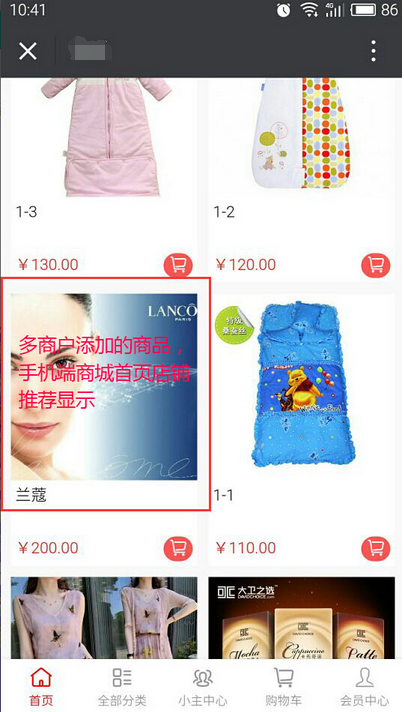 多商戶添加商品時(shí)的“商品屬性”無“推薦”,所以添加的商品不能在商城首頁進(jìn)行顯示,需要商城在后臺(tái)對(duì)多商戶添加的商品編輯“商品屬性”選擇“推薦”,商品就在手機(jī)端【商城首頁】——【店鋪推薦】中顯示,單只是顯示商品的名稱和價(jià)格,點(diǎn)擊進(jìn)入后才顯示多商戶商家信息,參見下圖: