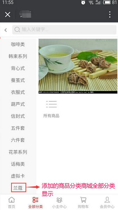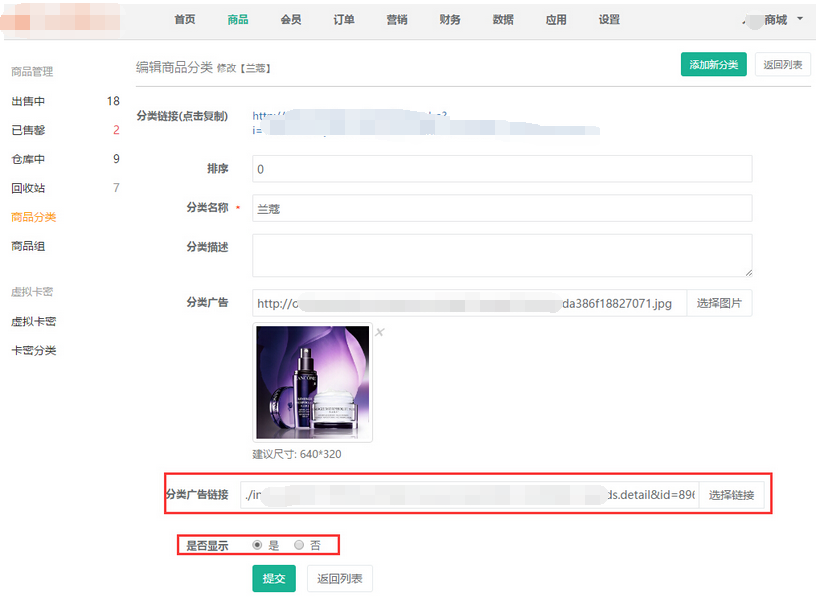 多商戶后臺(tái)無添加【商品分類】權(quán)限,添加商品選擇分類沒有適合自己商品的分類信息時(shí),需要商城協(xié)助添加商品分類信息,商城添加分類信息是否顯示,如果選擇的“顯示”,則在手機(jī)端前臺(tái)【全部分類】中會(huì)顯示分類信息,點(diǎn)擊分類即可進(jìn)入分類鏈接的多商戶商品,反之則不顯示,商城添加后,多商戶選擇即可,因商品分類不是必選項(xiàng),也可不選,參見下圖: