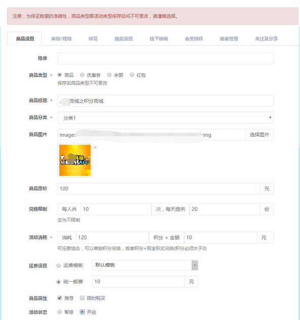 商品類型:點(diǎn)擊選擇(商品)保存后,此類型將無法修改