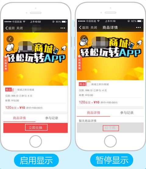活動(dòng)狀態(tài):勾選“開啟”才能對(duì)商品兌換,反之則不能兌換,顯示商品下架,且不在首頁顯示,參見下圖: