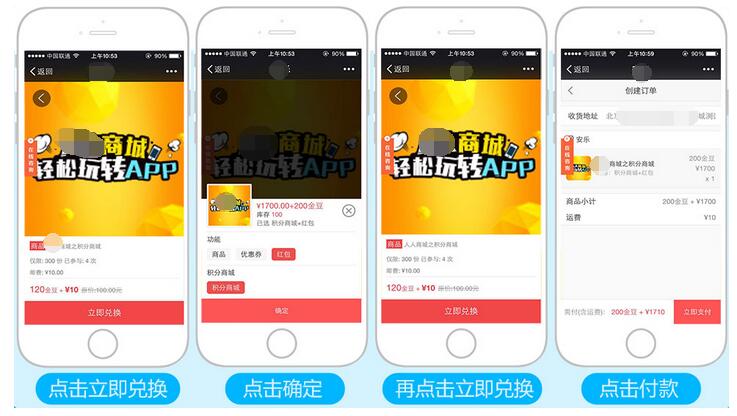 其操作規(guī)則與商城商品啟用商品規(guī)格一致,會(huì)員點(diǎn)擊【立即兌換】選擇相應(yīng)的規(guī)格后,要再次點(diǎn)擊【立即兌換】,才到支付頁面,參見下圖: